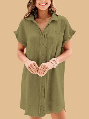 Paintcolors Women's Cotton Button Down Shirt Short Sleee Dresses Tunics Oversized Beach Cover up Blouse Tops with Pockets 5