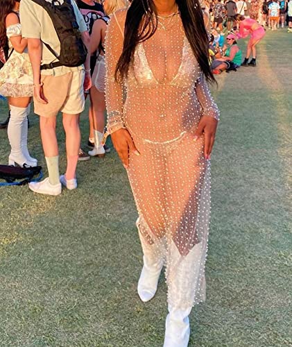 xxxiticat Women's Rhinestone Mesh Cover Ups Long Sleeve Fake Pearl Bubble Bead Crystral See Through Beach Party Maxi Dress 5