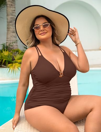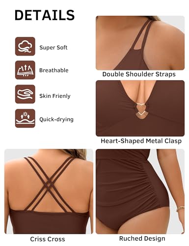 • One Piece Bathing Suit: Deep v-neck romper swim suit, double straps crisscross backless bathing suits,plus size one-piece swimsuits, stylish full coverage design provides a more snug fit, ruched design has tummy control effect; heart-shaped metal connection design is very unique