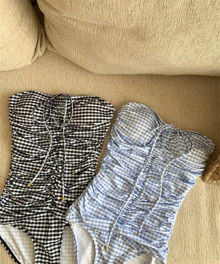 HOT ! Women's One-Piece Swimsuits, Neck Strapless Monokini, Vintage Plaid Bathing Suit, Female Tummy Control Swimwear