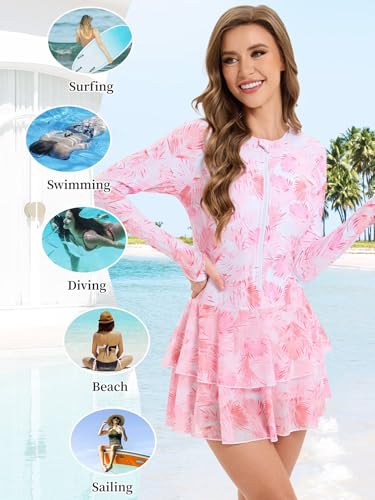 HOT ! Womens Rash Guard Long Sleeve UPF 50+ Zip Up One Piece Swimsuits with Shorts Modest Swim Dress with Built in Bra