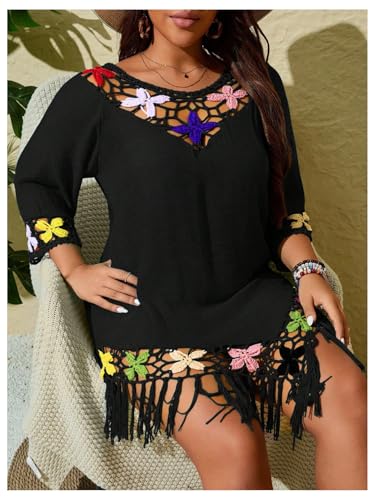 Verdusa Women's Plus Size Boho Hollow Out Floral Fringe Beach Cover Up Dress 3/4 Sleeve Tunic Dress 6