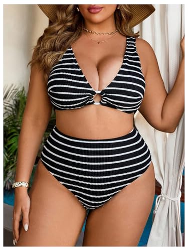 MakeMeChic Women's Plus Size High Waisted Bikini Set Striped V Neck Ring Tummy Control Bathing Suit Swimsuit 6