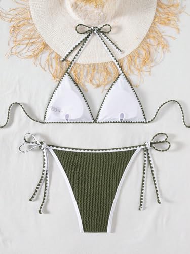 Fanuerg Women's Ribbed Triangle Bikini Sets Whip Stitch Halter 2 Piece Swimsuits Color Block Side Tie Bathing Suit 6