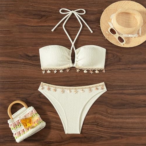 • Features: Plain solid color, geometric texture, shell fringe decoration, halter bikini top and bottom, 2 piece swimwear for women
