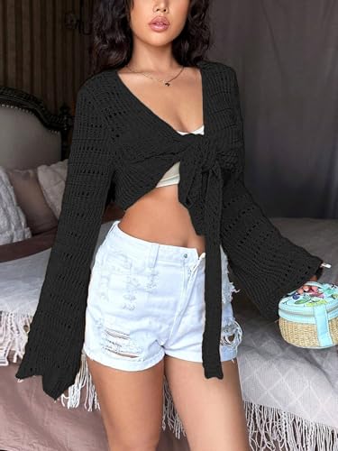• This boho kimono cover up has a unique crochet knit design, an open front with an adjustable tie, a batwing long sleeve, breathable mesh hollow, drop shoulder, and ribbed hem.