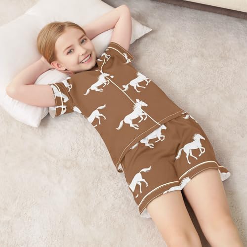 Satin Pajama Sets Short Sleeve Brown Background with Horses Button Down Silky Nightwear 2 Piece PJS 5-14Y 6