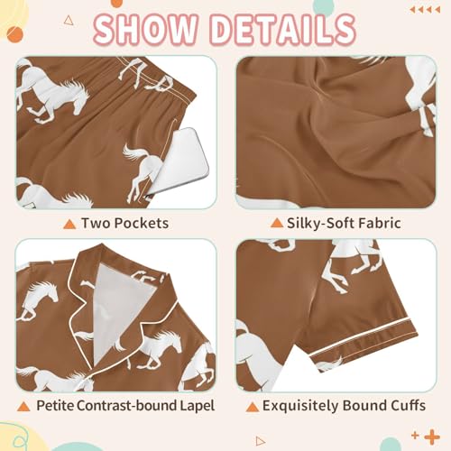 Satin Pajama Sets Short Sleeve Brown Background with Horses Button Down Silky Nightwear 2 Piece PJS 5-14Y 5