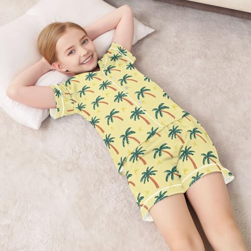 Cute Palm Tree Pattern Summer Satin Pajama Set, Cute Button-Down Sleepwear Pj Set for Sleep Wears 6