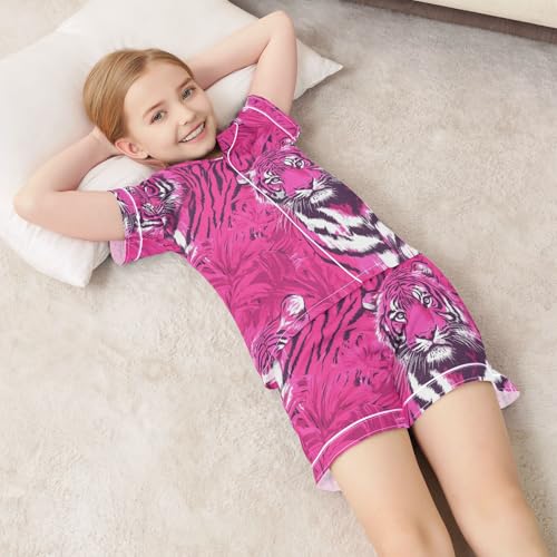 Satin Pajama Sets Short Sleeve Pink Tigers in Jungle Button Down Silky Nightwear 2 Piece PJS 5-14Y 7