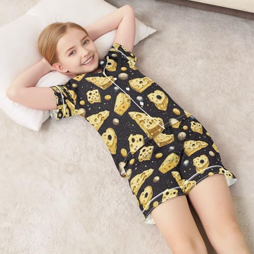 Satin Pajama Sets Short Sleeve Cheese Pieces in Space Pattern Button Down Silky Nightwear 2 Piece PJS 5-14Y 5