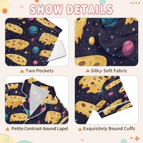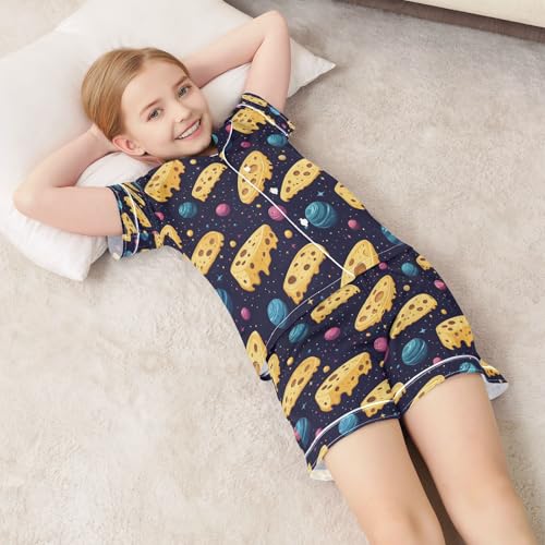 Satin Pajama Sets Short Sleeve Cheese Slices and Planets Pattern Button Down Silky Nightwear 2 Piece PJS 5-14Y 6