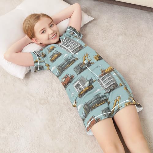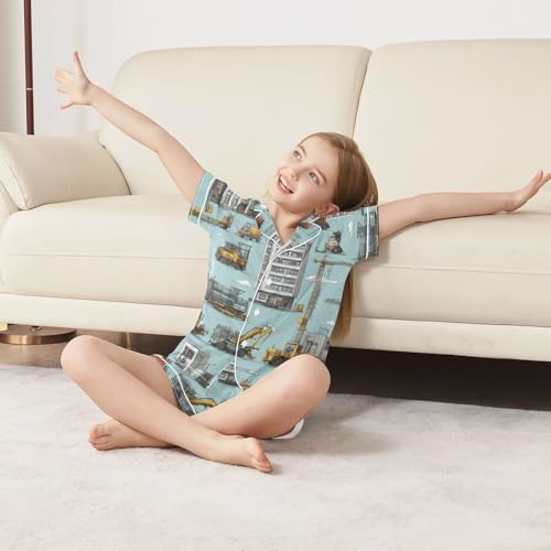 Satin Pajama Sets Short Sleeve Construction Vehicles and Buildings Button Down Silky Nightwear 2 Piece PJS 5-14Y 6