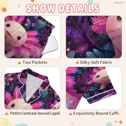 More information about Satin Pajama Sets Short Sleeve Beautiful Colorful Axolotls Button Down Silky Nightwear 2 Piece PJS 5-14Y