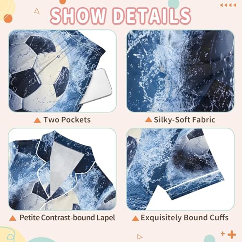 ALAZA Soccer Football Blue Water Satin Pajamas Set Short Sleeve Button Down Sleepwear Summer Pjs 2 Piece 4