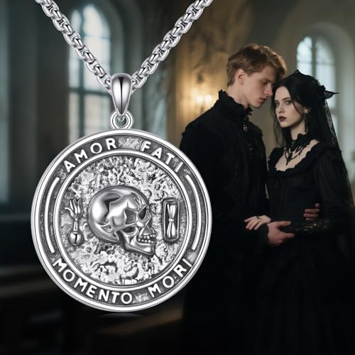 • Symbolic and Thought Design: This 925 sterling silver Memento Mori necklace features a pendant with profound symbolic meaning. The centerpiece is a skull, a classic Memento Mori symbol reminding wearers of the inevitability of death. Surrounding the skull, the Latin phrases "AMOR FATI" (love of fate) and "MEMENTO MORI" (remember that you have to die). The inclusion of additional symbols like a trident and an hourglass further enriches the design.