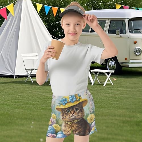 Girls Cute Easter Cat Yellow Hat Lounge Shorts Kids Floral Print Athletic Summer Pajama Shorts, X-Small 5