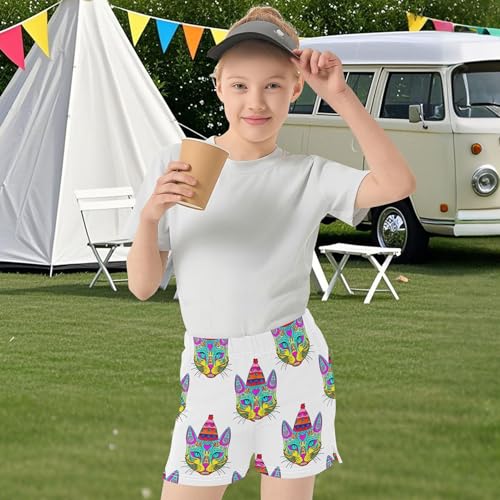 Girls Athletic Shorts Colorful Cat Faces White Print Kids Summer Casual Activewear Comfy Pajama Clothes, X-Small 6