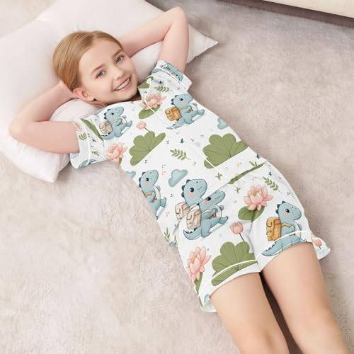 ALAZA Dinosaur Water Lily Cloud Pajamas Satin Pajama Set Short Sleeve Button Down Sleepwear 3