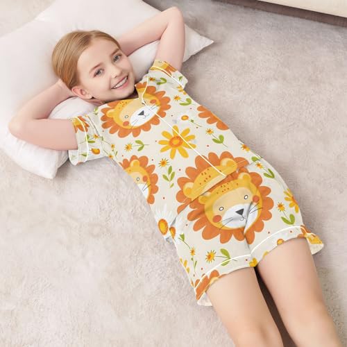 ALAZA Cute Lion Blossom Floral Pajamas Satin Pajama Set Short Sleeve Button Down Sleepwear 3