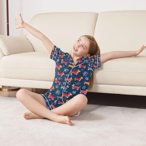 senya Dachshund Dogs Firework Satin Summer Pajama Sets Silk Short Sleeve Button Down Sleepwear 1