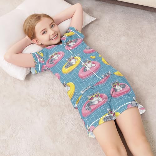 HOT ! senya Cat Swimming Ring Satin Summer Pajama Sets Silk Short Sleeve Button Down Sleepwear