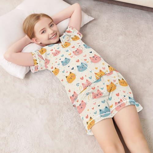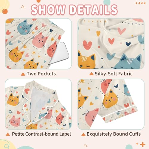 ALAZA Cat Head Love Heart Pajamas Satin Pajama Set Short Sleeve Button Down Sleepwear 3