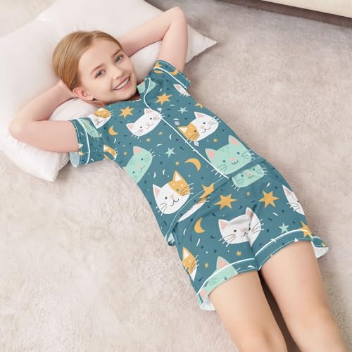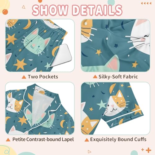 ALAZA Cute Cat Star Moon Pajamas Satin Pajama Set Short Sleeve Button Down Sleepwear 3