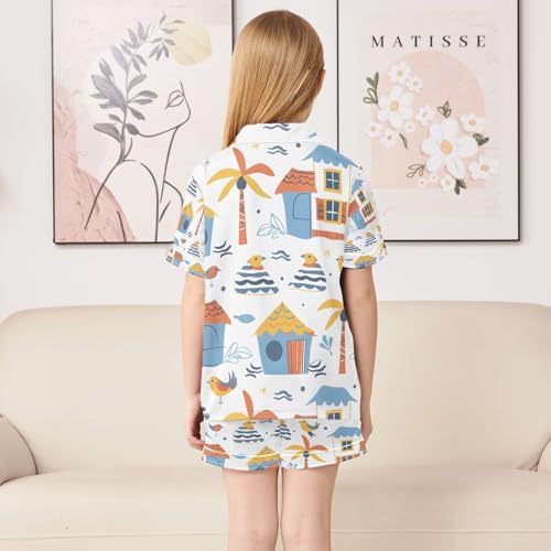 HOT ! senya Cartoon Beach House Satin Summer Pajama Sets Silk Short Sleeve Button Down Sleepwear