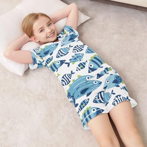ALAZA Funny Striped Fish Blue Pajamas Satin Pajama Set Short Sleeve Button Down Sleepwear 7