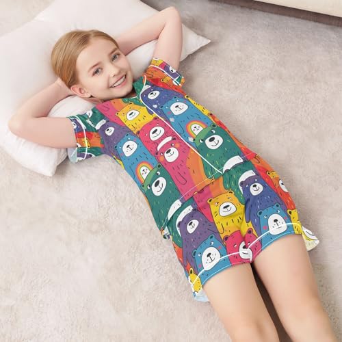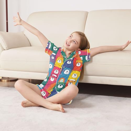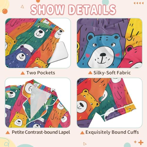ALAZA Bear Colorful Cartoon Pajamas Satin Pajama Set Short Sleeve Button Down Sleepwear 1
