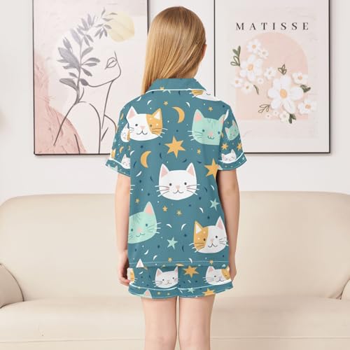 senya Cute Cat Face and Stars Satin Summer Pajama Sets Silk Short Sleeve Button Down Sleepwear 6
