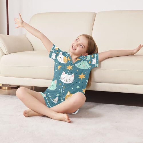 senya Cute Cat Face and Stars Satin Summer Pajama Sets Silk Short Sleeve Button Down Sleepwear 4