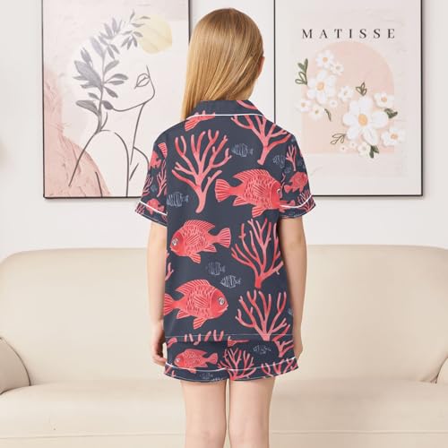 senya Red Fish Coral Satin Summer Pajama Sets Silk Short Sleeve Button Down Sleepwear 1