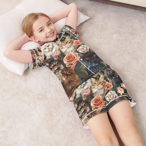 senya Cats Beautiful Roses Satin Summer Pajama Sets Silk Short Sleeve Button Down Sleepwear 1