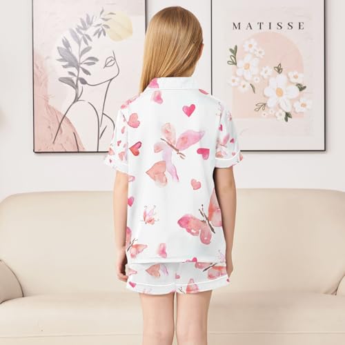 senya Pink Butterflies with Hearts Satin Summer Pajama Sets Silk Short Sleeve Button Down Sleepwear 1