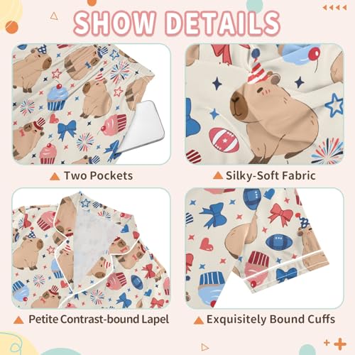 HOT ! Cute Capybara Colorful Stars Summer Satin Pajama Set, Cute Button-Down Sleepwear Pj Set for Sleep Wears