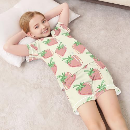 HOT ! Strawberry Cute Pink Cartoon Pattern Summer Satin Pajama Set, Cute Button-Down Sleepwear Pj Set for Sleep Wears