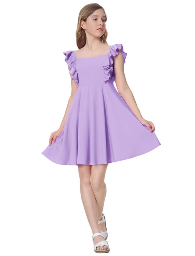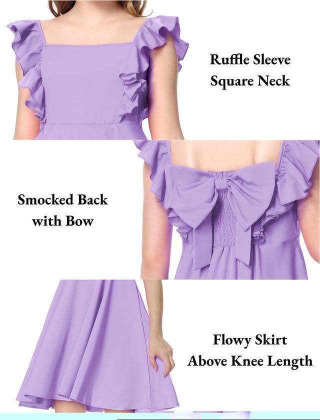 Mebius Girls Bow Back Square Neck Ruffle Sleeve Preppy Dress Tween Cute School Dance A Line Dresses 8-14Y 2