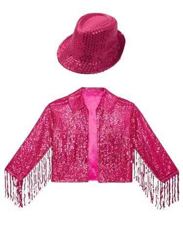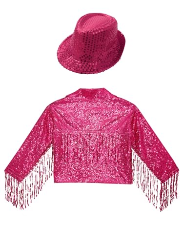 Kids Girls Sparkly Jazz Dance Outfit Tassel Jacket Long Sleeve Open Front Coat Outwear with Sequin Hat 6