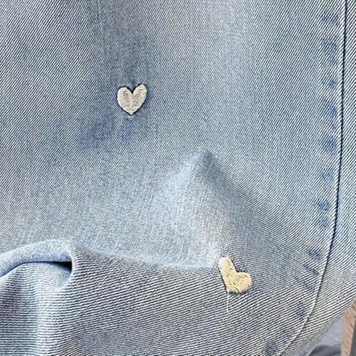 HOT ! Girls Wide Leg Heart Embroidery Jeans Baggy Straight Denim Pants Vintage Streetwear Elastic Waist Casual Trousers