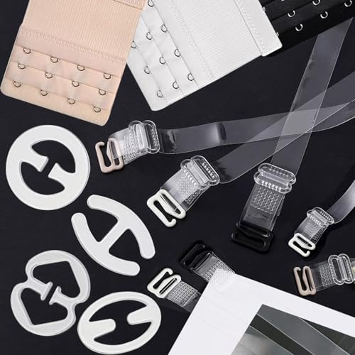 • Package including 18pcs clear invisible bra straps (White/Black/Skin tone buckles), 3pcs bra extenders (White/Black/Skin tone), and 4pcs bra strap clips (Transparent)