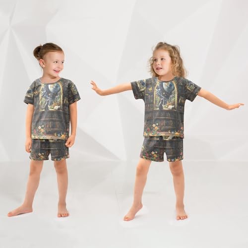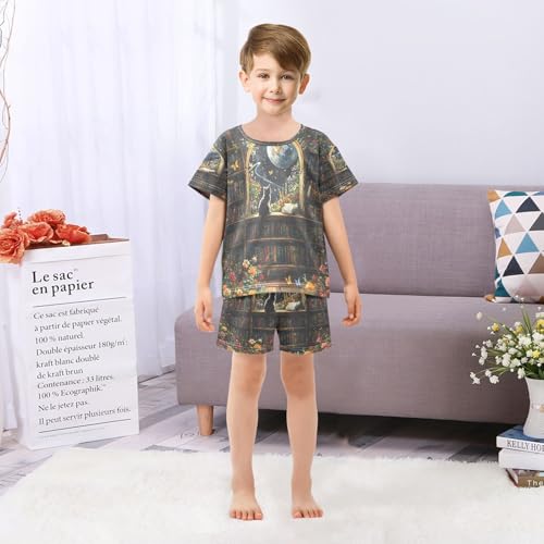 ALAZA Bookworm Bookshelf Cat Butterfly Flower Pajamas Set Short Sleeve Cotton Sleepwear Summer Pjs 2 Piece 5-14Y 2