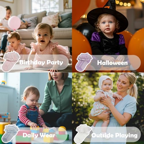 • Charming Details: Featuring a double-layer lace trim and subtle floral texture, these socks add a touch of elegance to any outfit. The frilly cuffs look adorable peeking out from shoes like Mary Janes, ballet flats, or even boots, giving your little girl a sweet and polished appearance.