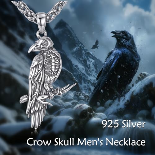 Raven Necklace 925 Sterling Silver Raven Skull Crow Pendant Gothic Jewelry for Men, w/Stainless Stain 22"+2" 3