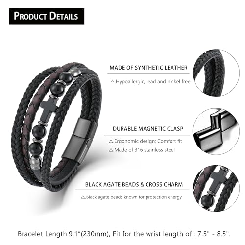 More information about Men's Leather & Stone Cross Bracelet - Christian Religious Jewelry for Men (Lapis/Onyx/Turquoise/Tiger Eye), Braided Design with Alloy Clasp, 8.3" & 9.1" Sizes