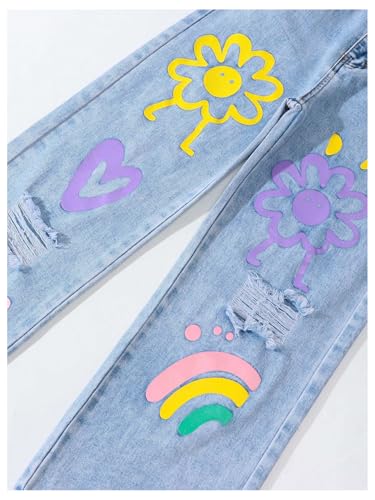 WDIRARA Girl's Cute Print Ripped Baggy Jeans Distressed Straight Leg Denim Pants 6
