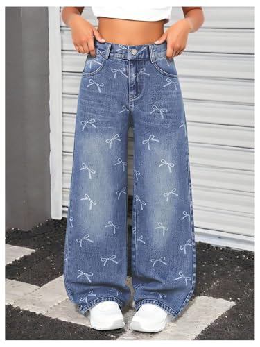 SHENHE Girl's Baggy Jeans Bow Print Wide Leg High Waisted Loose Y2k Jeans Denim Pants 4