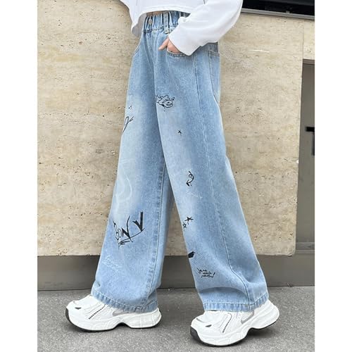 HOT ! Baggy Jeans for Girls Graphic Prints Wide Leg Pants Streetwear Adjustable Waist Cute Jeans for Girls Y2K Denim Pants