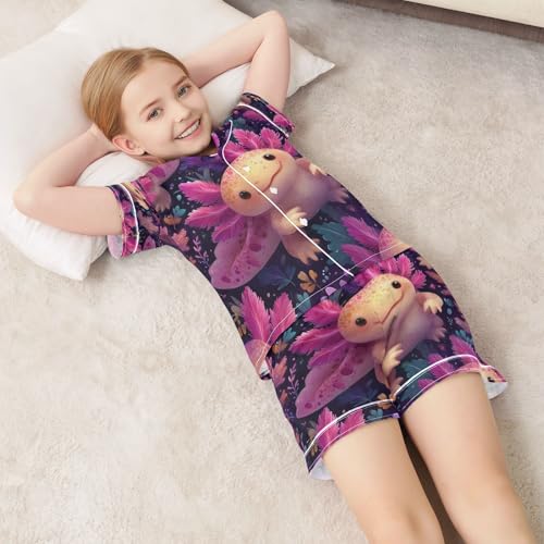 HOT ! Satin Pajama Sets Short Sleeve Cute Axolotls Colorful Leaves Button Down Silky Nightwear 2 Piece PJS 5-14Y